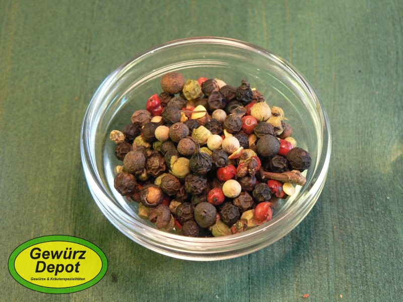 Zutaten: Pfeffer (schwarz, weiß, grün), Rosa Pfeffer, Kubebenpfeffer, Piment, Chilis [kann Spuren enthalten von Senf und Sellerie]