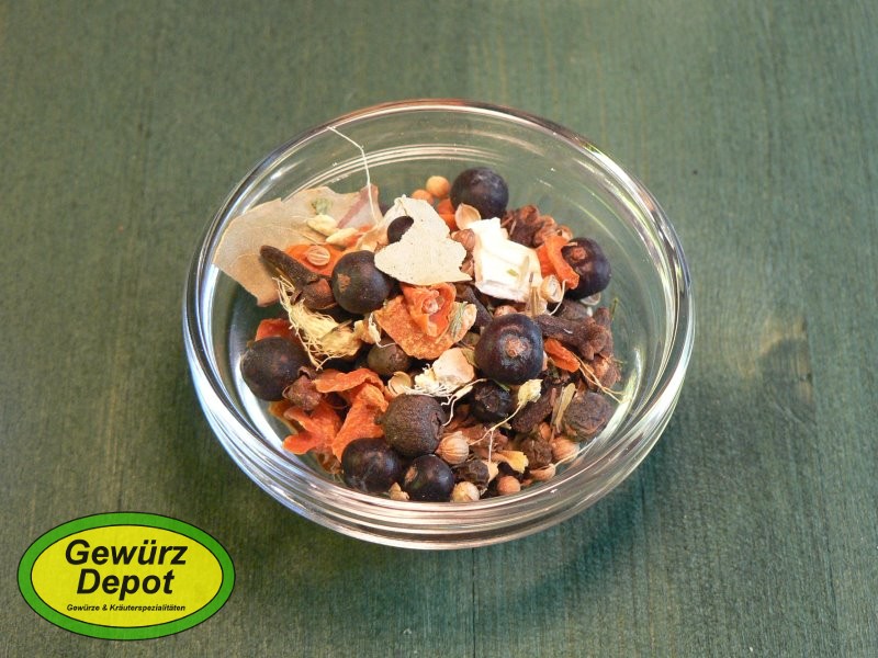 Zutaten: Pfeffer, Piment, Senfkörner, Wacholderbeeren, Koriander, Paprika, Karotten, Ingwer, Dill, Rosa Beeren, Nelken, Lorbeer, Zimt, Rosmarin, Thymian, Majoran, Salbei, Kardamom, Lauch, Pastinaken, Sellerie, Petersilie, Zwiebel, Tomate Muskatnuss Verw.: Für alle Wild- und Sauerbratengerichte