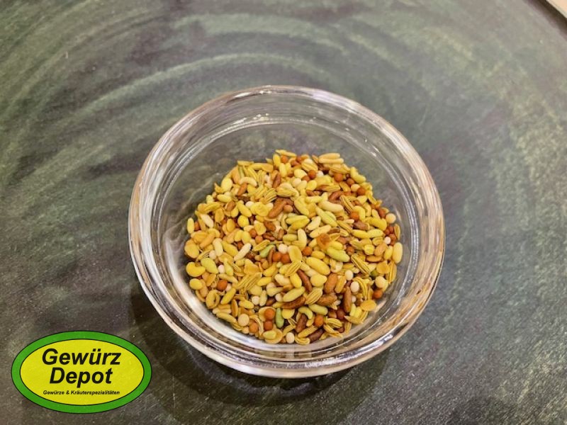 Zutaten: Koriander, Kurkuma, Paprika, Ingwer, Zwiebel, Karotten, Lauch, Senf, Sellerie, Knoblauch, Bockshornklee, Cumin, Chili, Fenchel, Piment, Sternanis