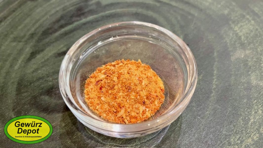 Zutaten: Meersalz, Koriander, Knoblauch, Zwiebel, Paprika, Kreuzkümmel, Chiliflocken, Petersilie, Koriander, Orangenextrakt